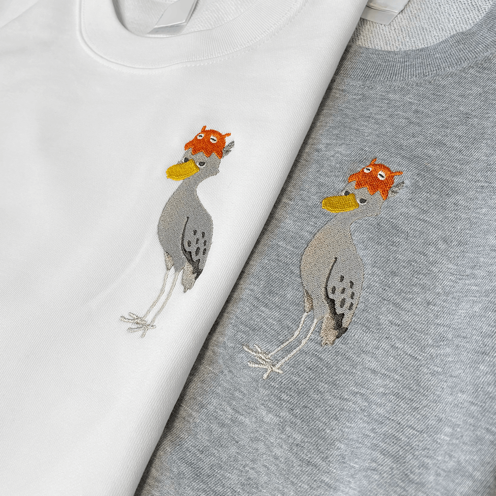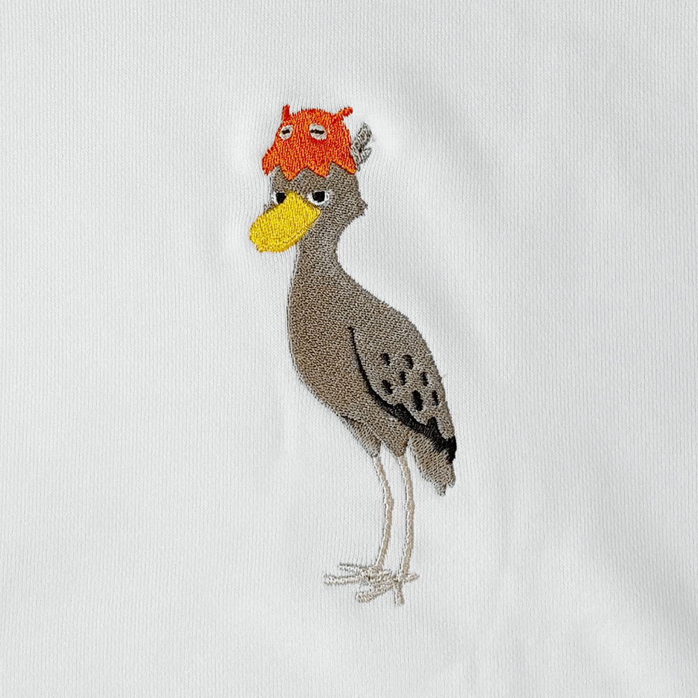 ハシビロコウとメンダコさんの刺繍が、ほどよく目を引く仕上がりです。