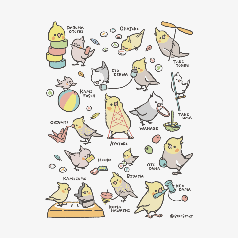 オカメインコさんたちと一緒に、昔遊びをお楽しみください。