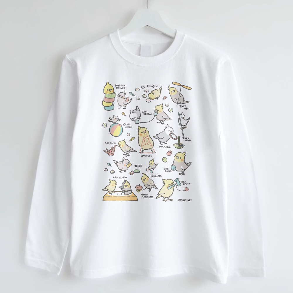 長袖Tシャツ 昔の遊び おはじき 竹とんぼ 紙風船 折り紙 オカメインコ