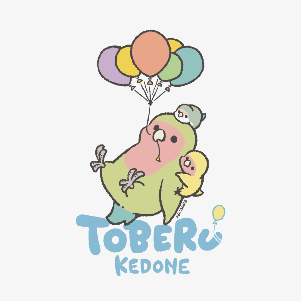 風船につかまって、お空をお散歩するコザクラインコさんたちを描きました。