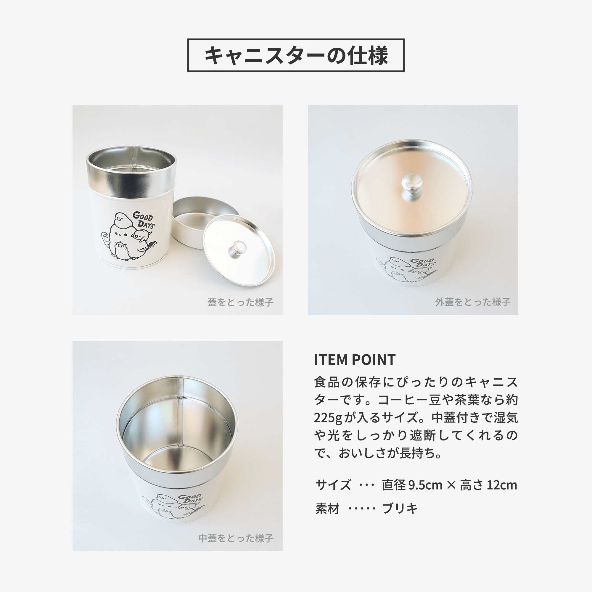 | 注意事項 | ●キャニスター ※水分を多く含む食品は保存に適していません。錆の原因になります。 ※塩分のある食品も錆びの原因となりますので、缶に直接接触しないようにしてください。 ※水分がつくと錆びる恐れがありますので水洗いはしないでください。 ※日頃まめに手のひらでなででいただくと、手の油で艶が出てきます。 ※缶を床に落としたりぶつけたりすると、塗料が剥げたりへこんだりすることがありますのでお気を付けください。 ※粘着性の高い市販のシール、テープを缶の表面に貼ると、塗料が剥げてしまう恐れがあります。 ※食器洗い機、電子レンジではご使用にならないでください。 |