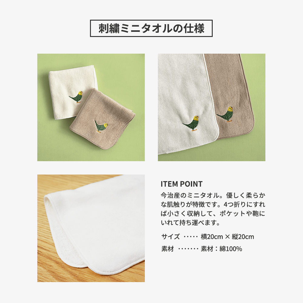 20×20cmで、日常使いにちょうどいいサイズのミニタオルです。