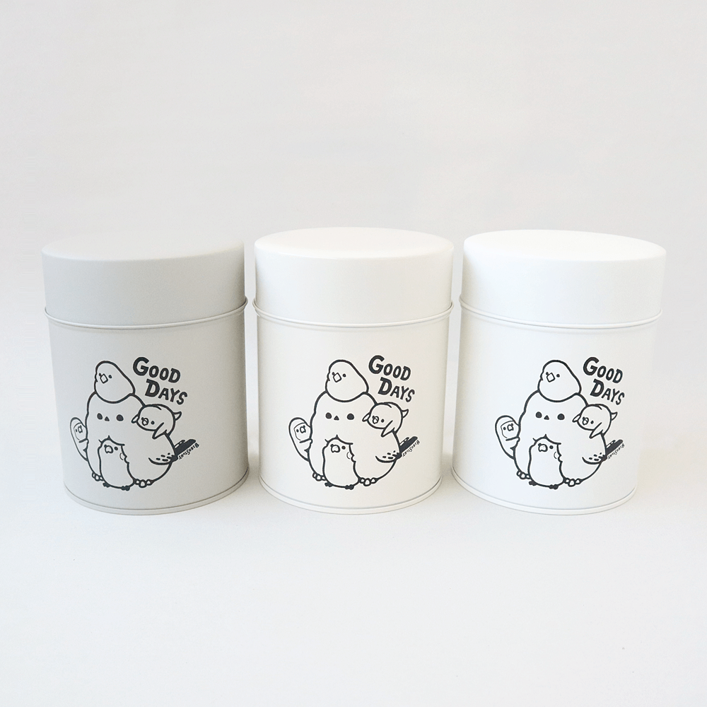 鳥さんたちがシマエナガさんにぎゅっと寄りそう、ほっこり温かなシーンを描いたキャニスターです。